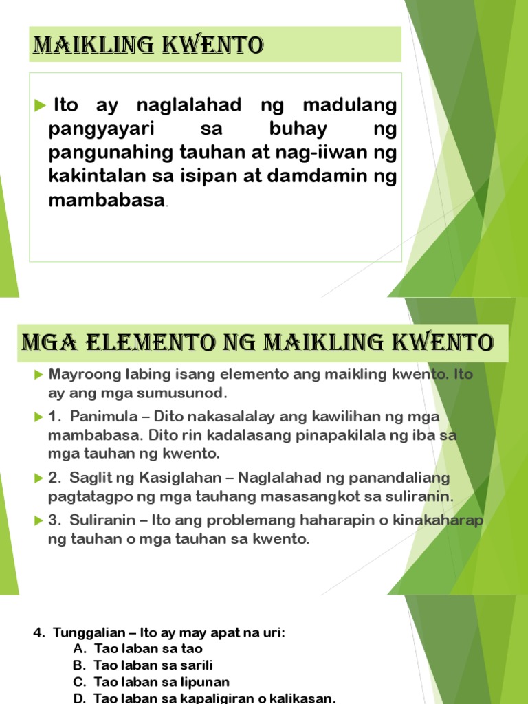 Tunggalian- Tao laban sa Lipunan. Tao laban sa kalikasan. Start studying 1st Filipino Maikling Kwento.